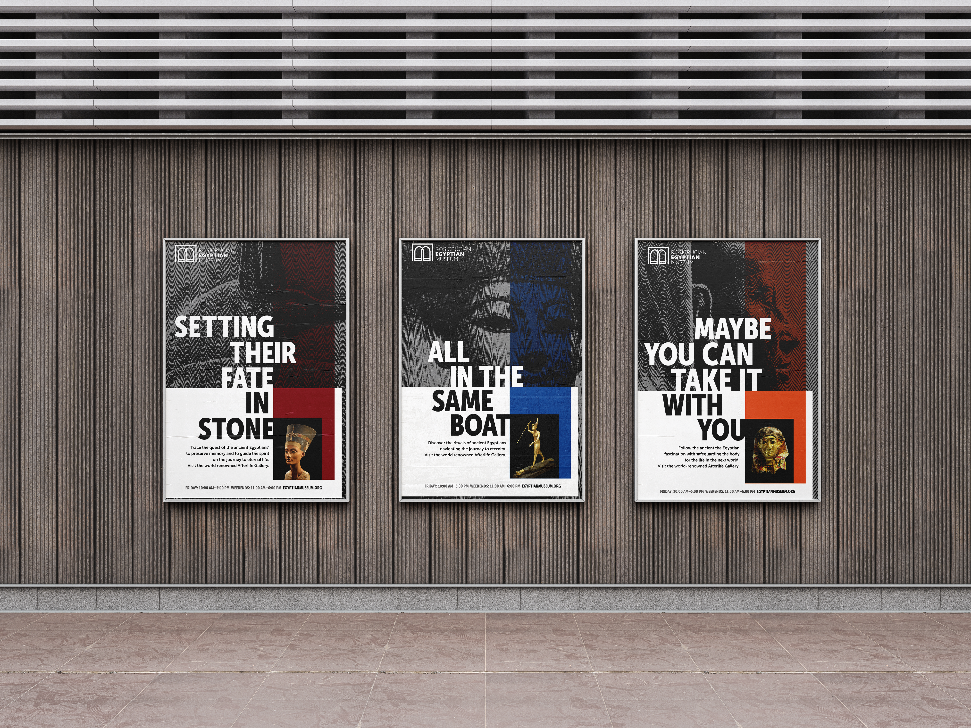 The print advertising expands the rebrand beyond the museum walls, introducing the Afterlife Gallery to a broader public audience. Through bold, visually compelling poster designs and cohesive messaging, it increases visibility and positions the museum as a contemporary cultural destination. This approach helps generate curiosity, strengthen brand recognition, and attract new visitors who may not have previously knew of the museum.